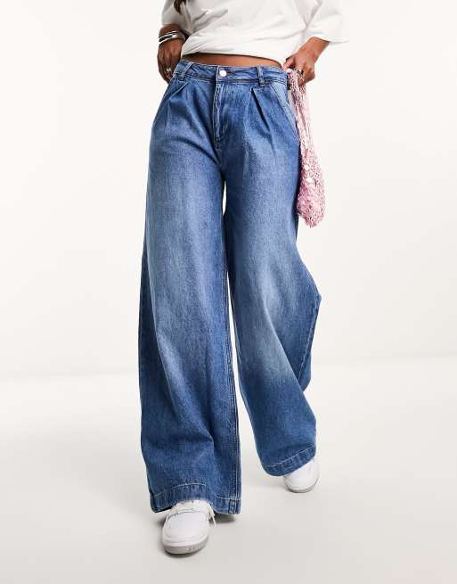 ASOS DESIGN pleated wide leg jeans in mid blue