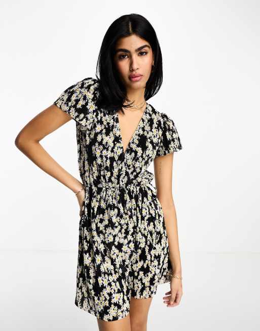 ASOS DESIGN plisse puff sleeve mini dress with elastic side tie in daisy