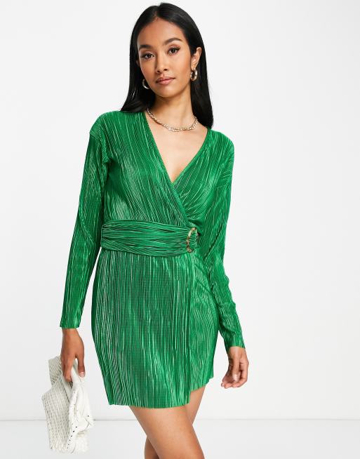 ASOS DESIGN plisse wrap mini dress with tortoiseshell trim in green