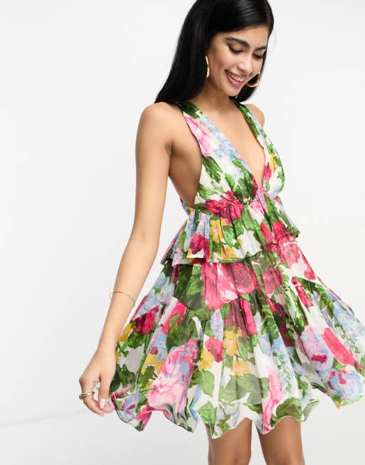 ASOS DESIGN plunge pleated tiered mini dress in white based floral print