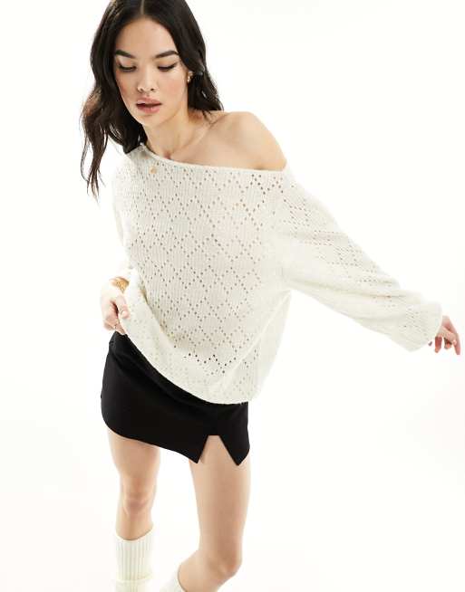 ASOS DESIGN pointelle knit one shoulder jumper in ecru