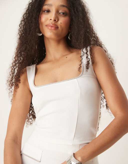 ASOS DESIGN ponte singlet top with diamante trim in white (part of a set)
