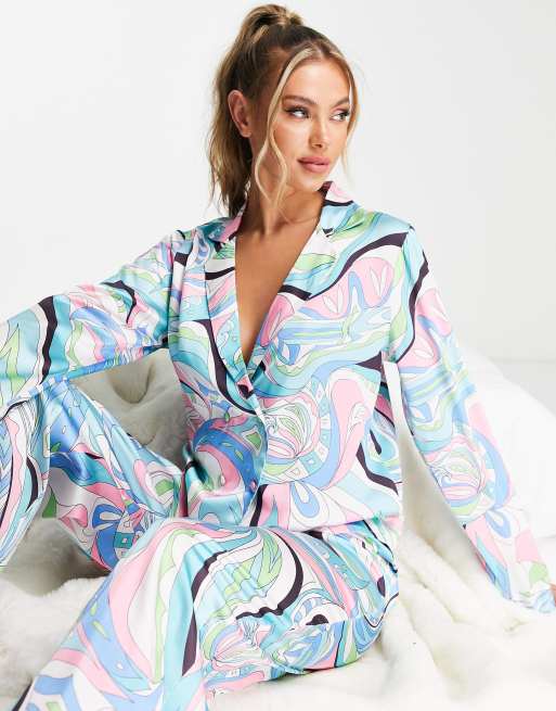ASOS DESIGN premium satin marble scarf print double breasted shirt & pants pyjama set in multi