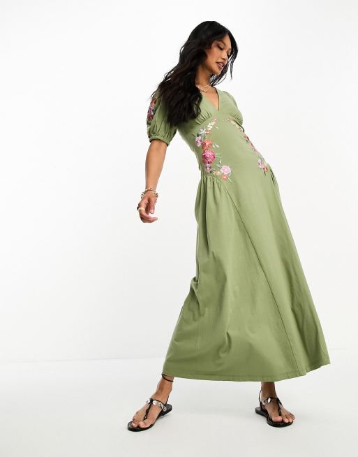 ASOS DESIGN puff sleeve midi tea dress with embroidery in sage