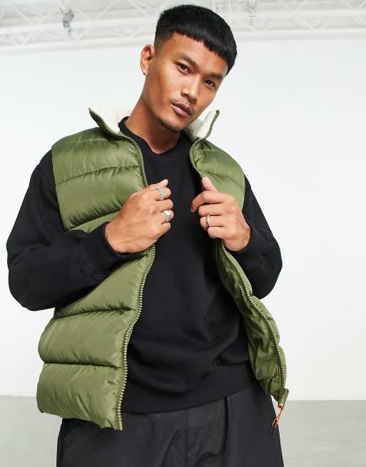 ASOS DESIGN puffer vest with fleece lined collar in khaki