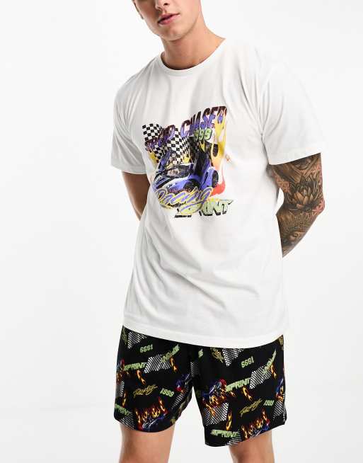 ASOS DESIGN pyjama set with racing graphic in black and white with t-shirt and shorts