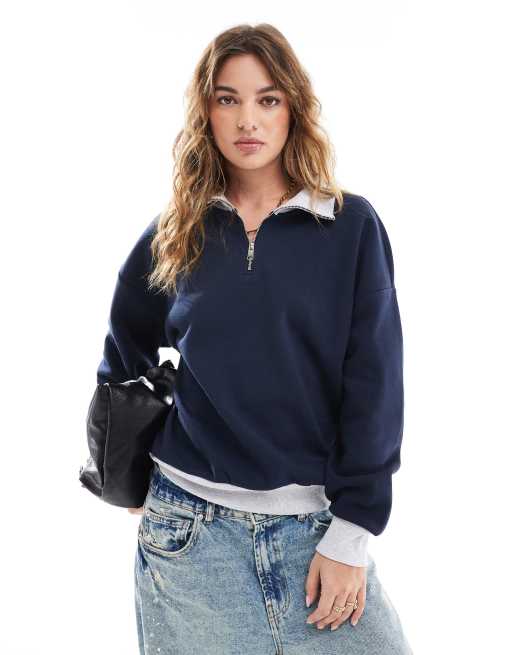 ASOS DESIGN quarter zip pullover contrast detail sweat in navy