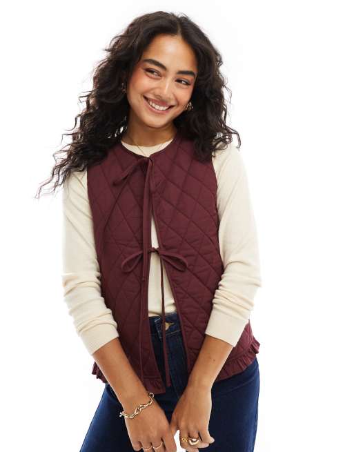 ASOS DESIGN quilted tie front vest in burgundy