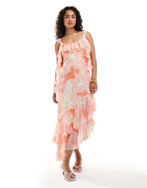 ASOS DESIGN raw edge tendril midi dress with double layer frill hem in watercolour floral