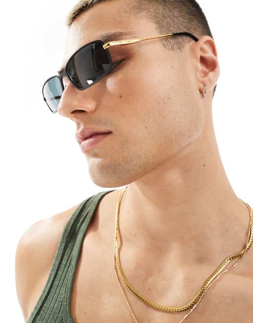 ASOS DESIGN rectangle sunglasses with gold temples in matte black