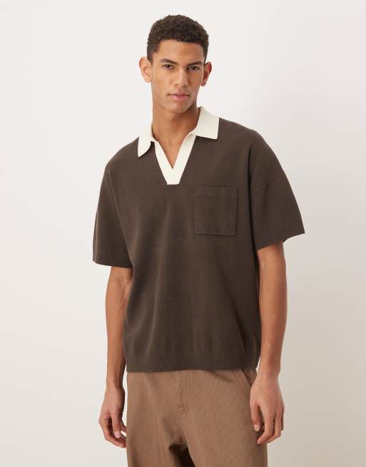 ASOS DESIGN relaxed knitted notch neck polo shirt with front pocket in brown