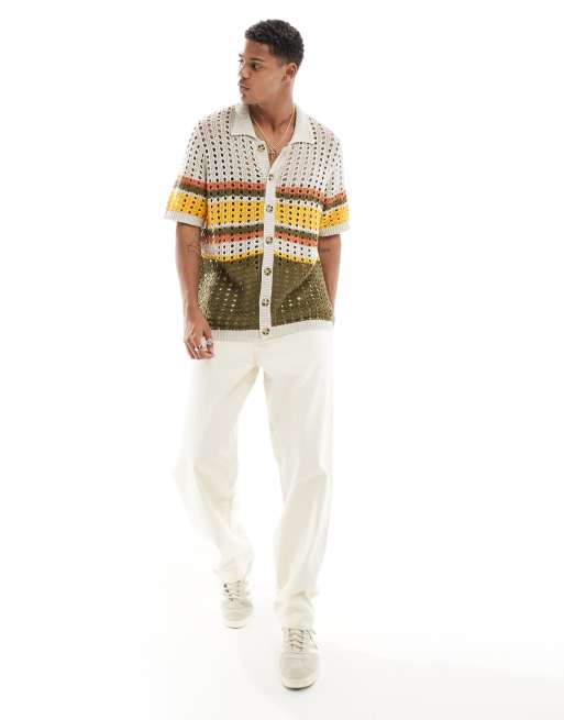 ASOS DESIGN relaxed knitted pointelle button through stripe polo in stone
