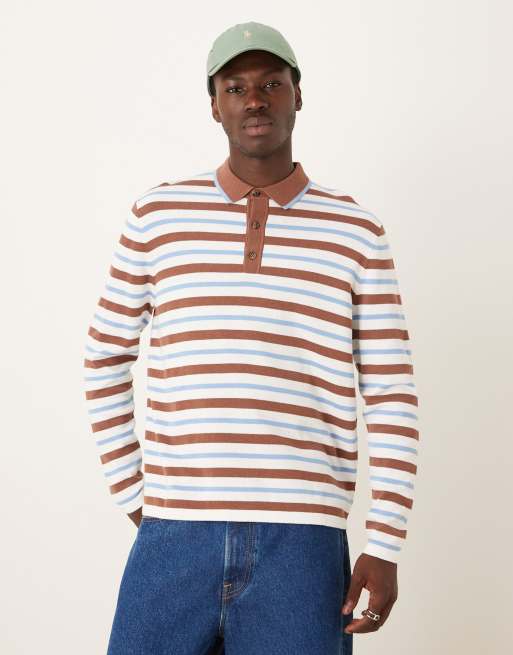 ASOS DESIGN relaxed knitted polo in ecru with brown and blue stripes