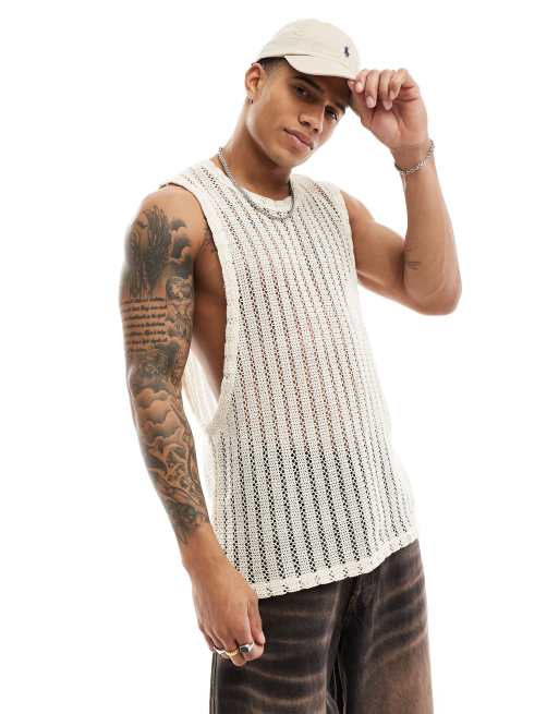 ASOS DESIGN relaxed scoop neck singlet in open texture in beige