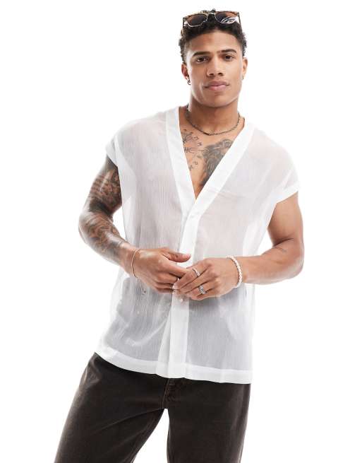 ASOS DESIGN relaxed sleeveless sheer shirt with embellished buttons in white