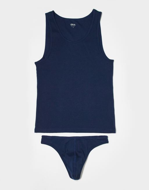 ASOS DESIGN rib lingerie thong and singlet set in navy