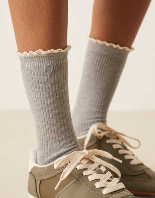 ASOS DESIGN ribbed contrast crochet frill socks in grey