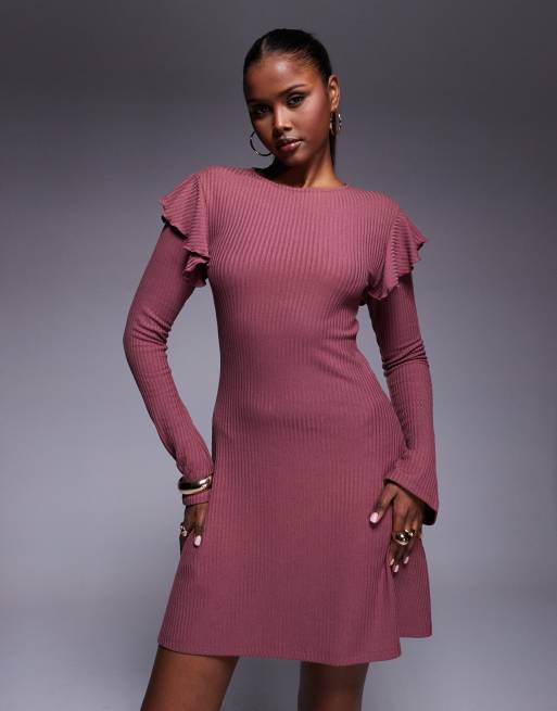 ASOS DESIGN ribbed frill shoulder mini dress in rose