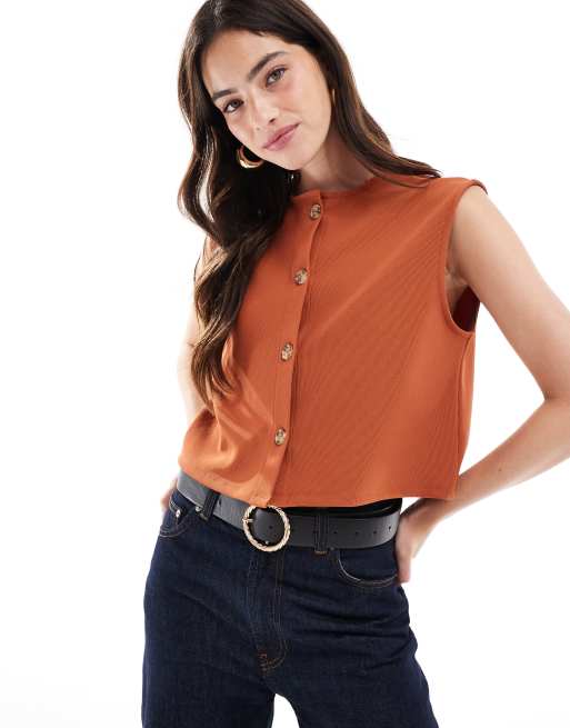 ASOS DESIGN ribbed wide shoulder boxy cropped waistcoat in rust