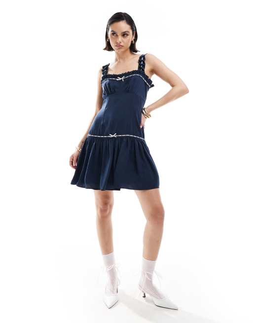 ASOS DESIGN ribbon frill strap mini dress with flippy hem in navy