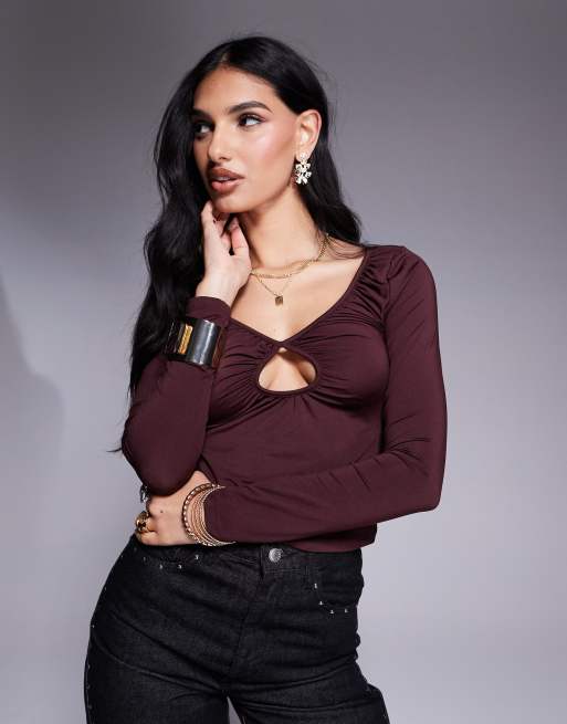 ASOS DESIGN ruched keyhole long sleeve top in brown