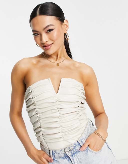 ASOS DESIGN ruched leather look bodysuit in cream