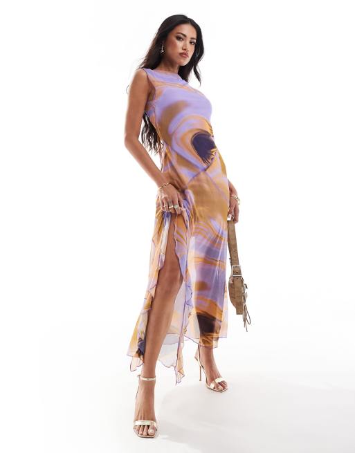 ASOS DESIGN ruffle detail mesh midaxi dress in purple swirl print