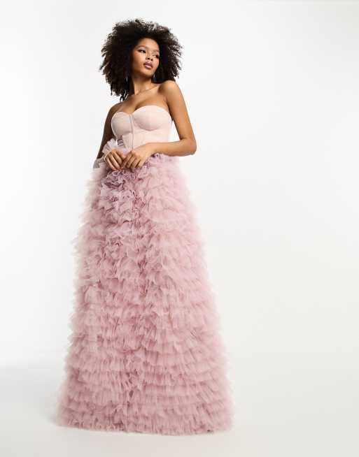ASOS DESIGN satin corset premium bandeau mesh ruffle maxi dress in dusty pink