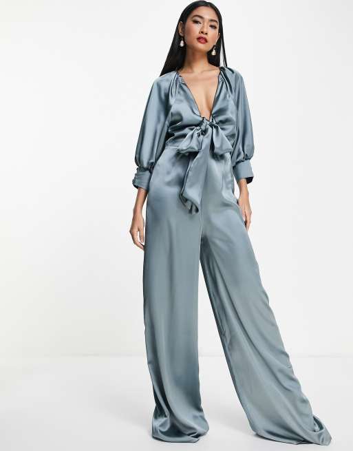 ASOS DESIGN satin tie front wide-legged jumpsuit in teal grey