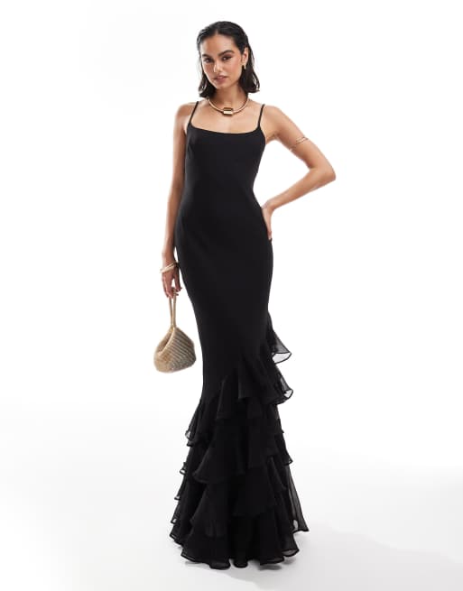ASOS DESIGN scoop neck bias maxi dress with ruffle hem in black