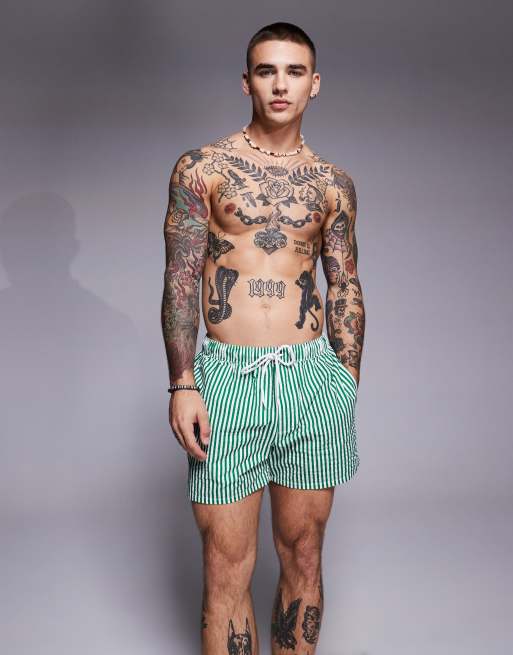 ASOS DESIGN seersucker stripe swim shorts in short length in green