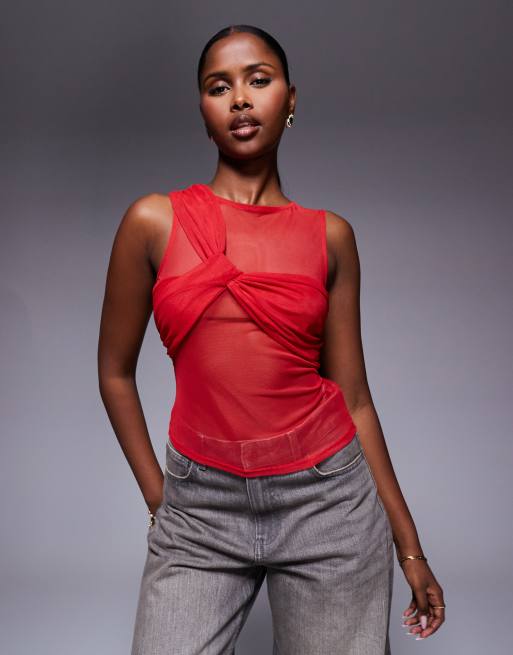 ASOS DESIGN sheer mesh layered twist singlet top in red