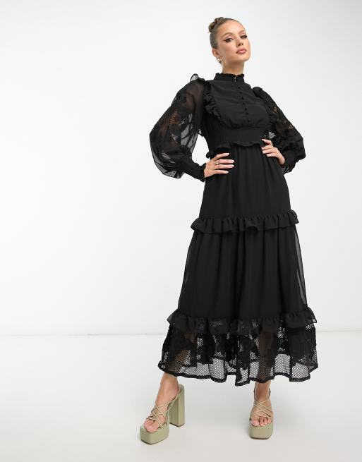 ASOS DESIGN shirred waist frill tiered maxi dress with mesh embroidery in black