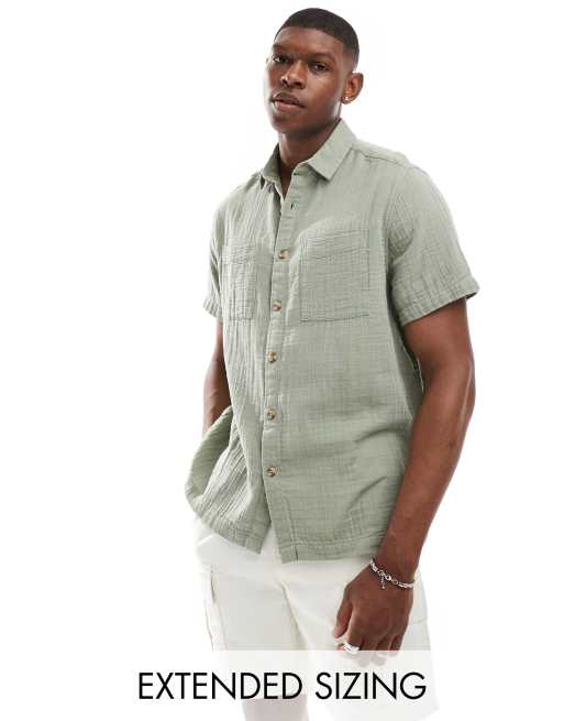 ASOS DESIGN short sleeve relaxed revere collar cheesecloth shirt in light khaki