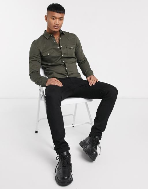 ASOS DESIGN skinny fit western denim shirt in khaki