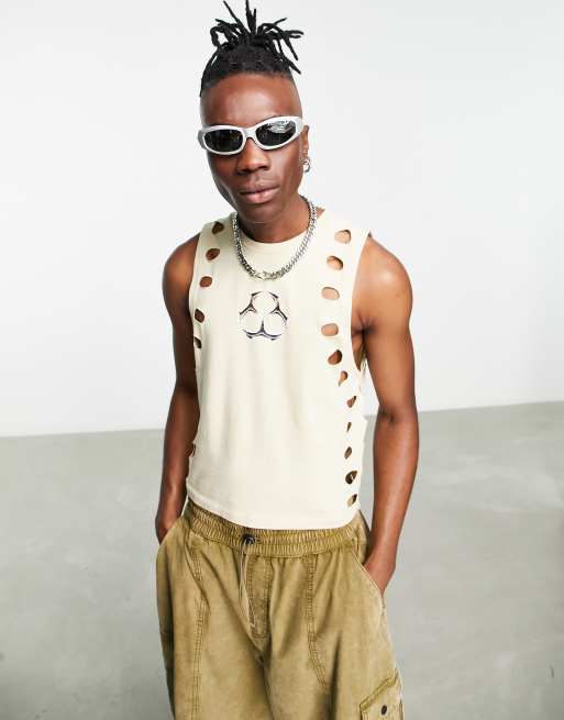 ASOS DESIGN skinny shrunken singlet in beige with splice detail and chest print