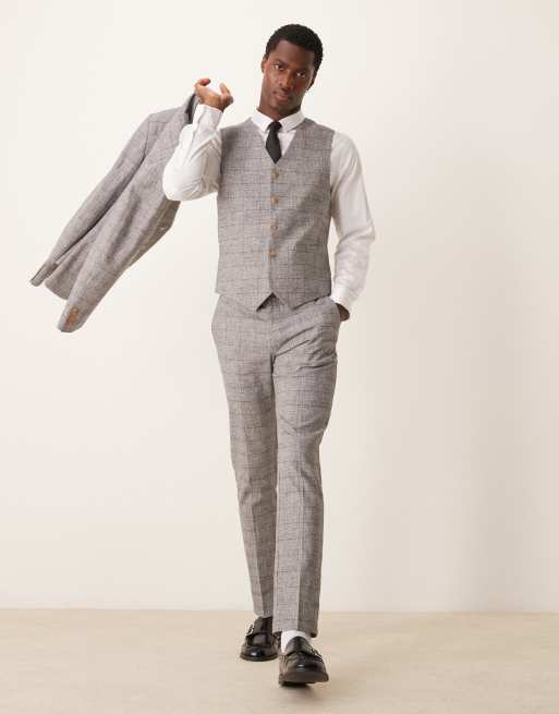 ASOS DESIGN skinny suit pants with linen in grey prince of wales check