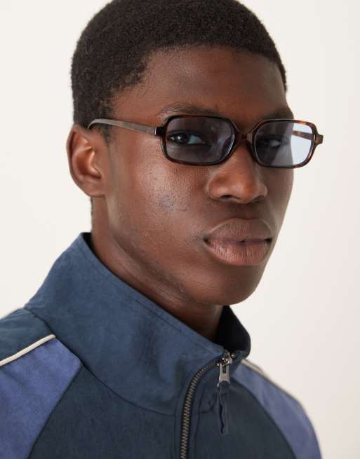 ASOS DESIGN slim rectangle sunglasses with blue lens and tortoiseshell frame