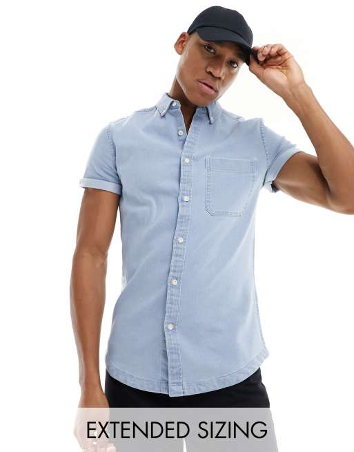 ASOS DESIGN slim roll sleeve denim shirt with button down collar in light blue wash