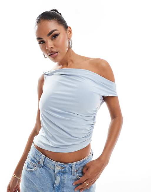 ASOS DESIGN slinky twisted off shoulder asymmetric top in light blue
