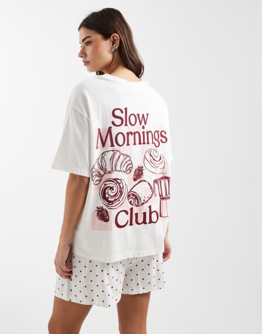 ASOS DESIGN Slow Mornings graphic short sleeve tee and short pyjama set in red