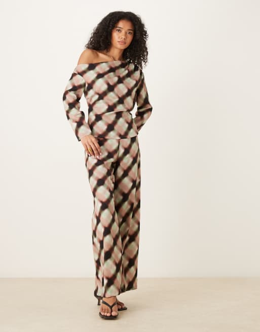ASOS DESIGN soft asymmetric top with ruched detail & clean front wide leg pants set in blurred check