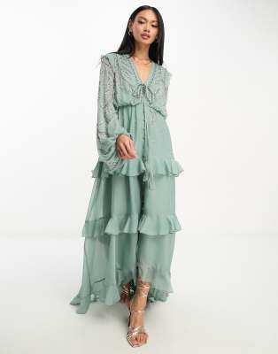 ASOS DESIGN soft midi dress with button front and trailing floral embellishment in sage