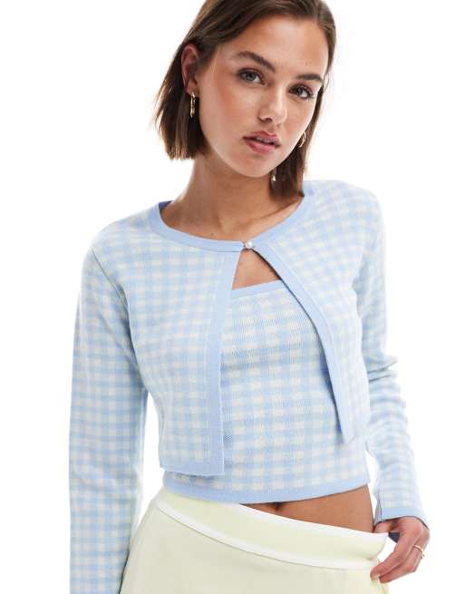 ASOS DESIGN split front crop cardigan in gingham in blue (part of a set)