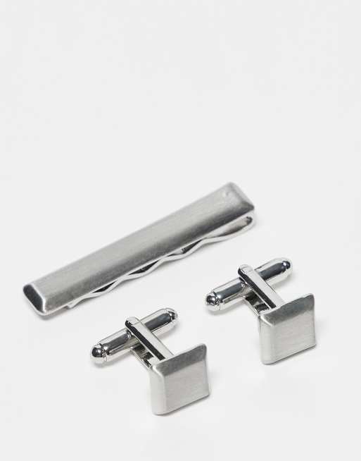 ASOS DESIGN square brushed cufflinks and tie bar in silver tone