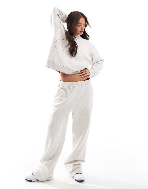 ASOS DESIGN straight leg trackies with chenille New Jersey graphic in oatmeal marl (part of a set)