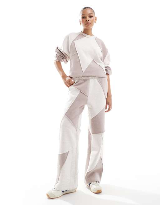 ASOS DESIGN straight leg trackies with patchwork detail in oatmeal mix (part of a set)
