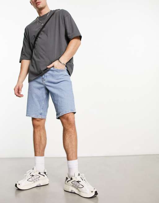 ASOS DESIGN stretch slim mid length denim shorts in light wash blue