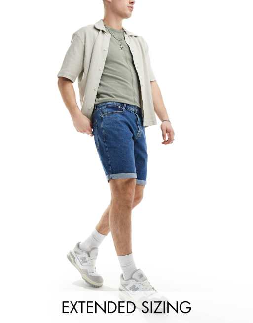 ASOS DESIGN stretch slim regular length denim shorts in mid wash blue