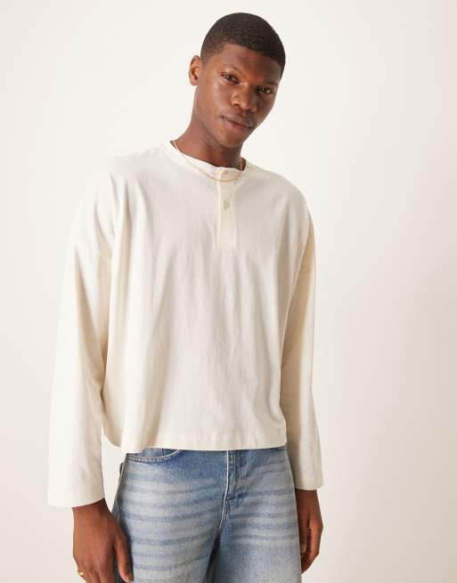 ASOS DESIGN super oversized cropped long sleeve t-shirt with henley neck in ecru